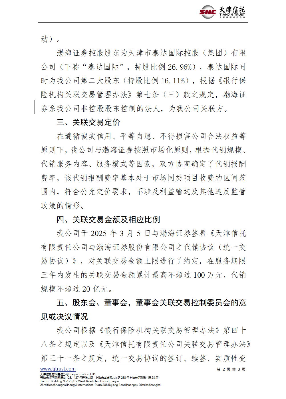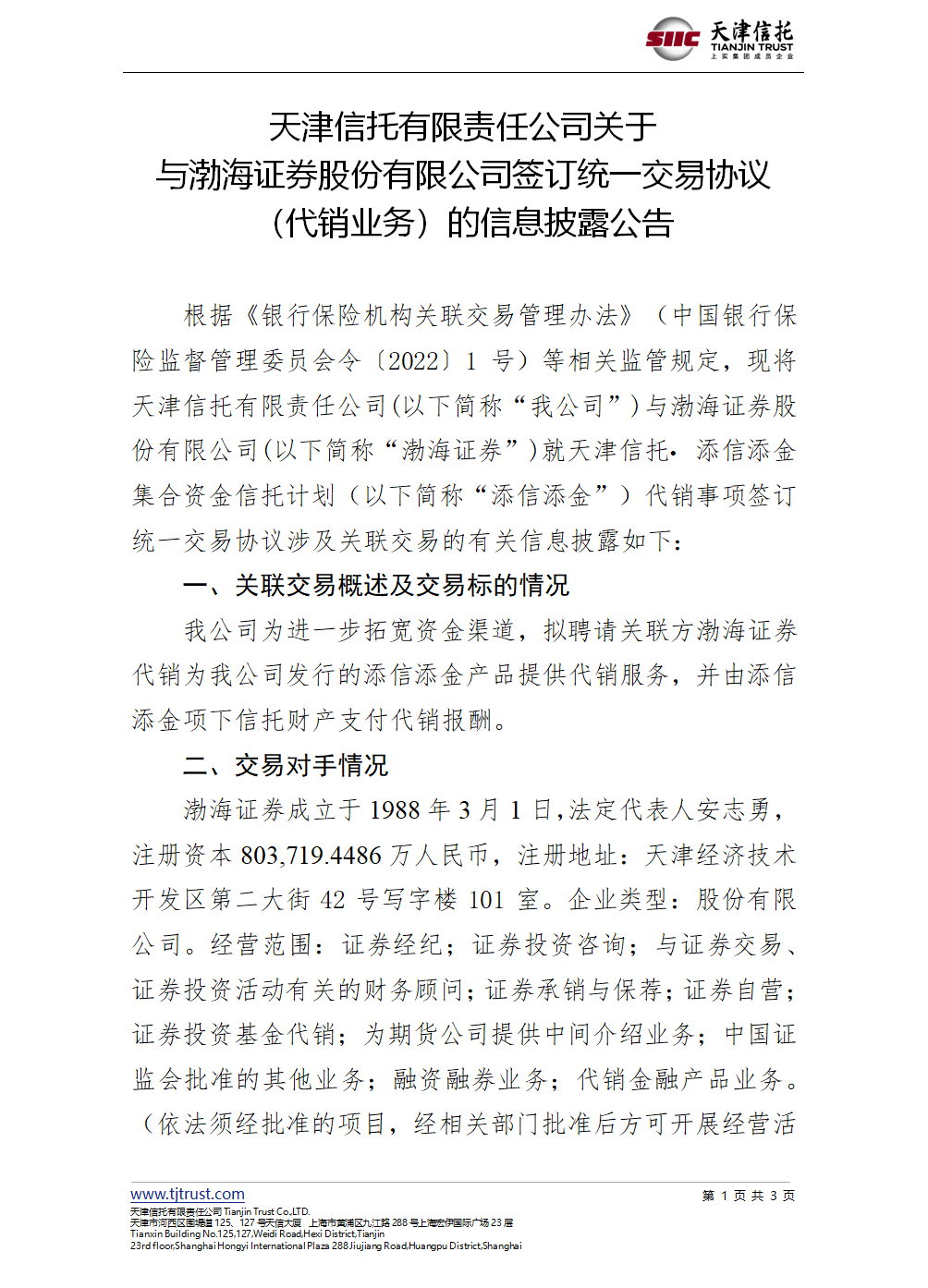 天津信托有限責(zé)任公司關(guān)于 與渤海證券股份有限公司簽訂統(tǒng)一交易協(xié)議 (代銷(xiāo)業(yè)務(wù))的信息披露公告