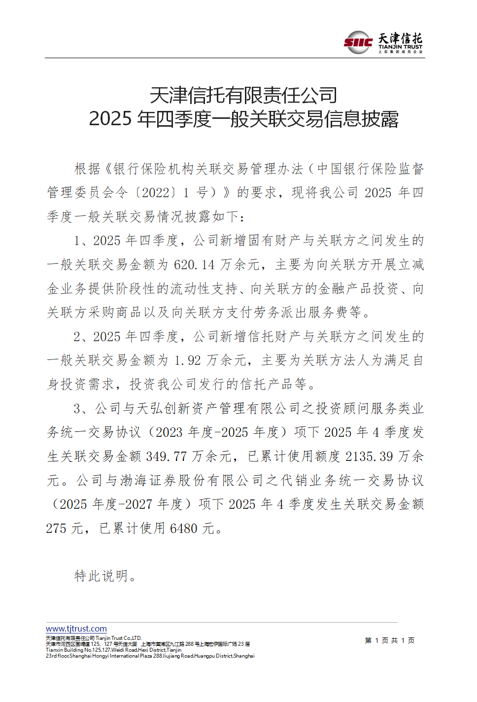 天津信托有限責(zé)任公司 2025年四季度一般關(guān)聯(lián)交易信息披露