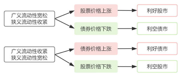 狹義流動性可以通過銀行體系的信貸投放、債券投資等信用活動,轉(zhuǎn)化為廣義流動性,因此,二者長期變動方向通常具有相關(guān)性。但受傳導(dǎo)速度及其他因素的影響,可能導(dǎo)致它們的變動存在時間差和方向相反的情況,從而引發(fā)“股債蹺蹺板”效應(yīng)。