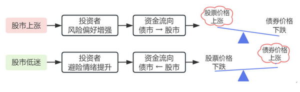 當(dāng)股市走強時,投資者風(fēng)險偏好增強,債券的吸引力降低,資金可能會從債市轉(zhuǎn)移到股市,導(dǎo)致債券價格下跌,股票價格上漲。而當(dāng)股市走弱時,投資者避險情緒提升,債券更受投資者青睞,可能導(dǎo)致資金從股市轉(zhuǎn)移到債市,推動債券價格上漲,股票價格下跌。