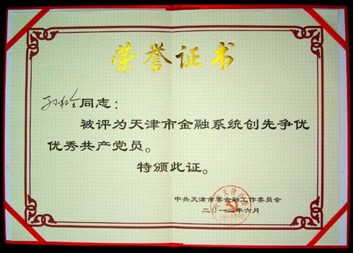 根據(jù)天津市委金融工委《關(guān)于表彰創(chuàng)先爭優(yōu)先進黨組織和優(yōu)秀共產(chǎn)黨員的決定》(津黨金發(fā)【2012】26號)文件精神,天津信托有限責任公司信托業(yè)務一部、三部、五部、市場營銷部聯(lián)合黨支部榮獲天津市金融系統(tǒng)先進黨組織榮譽稱號,業(yè)務經(jīng)營管理部孫紅全同志榮獲天津市金融系統(tǒng)優(yōu)秀共產(chǎn)黨員榮譽稱號。公司黨委號召全體黨員以此為榜樣,堅定理想信念,勤奮敬業(yè),開拓創(chuàng)新,立足本崗勇創(chuàng)佳績,為天信公司和天津經(jīng)濟社會又好又快的發(fā)展做出更大貢獻!