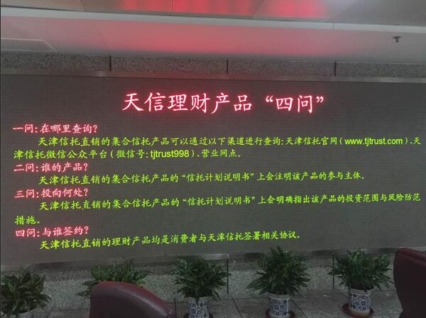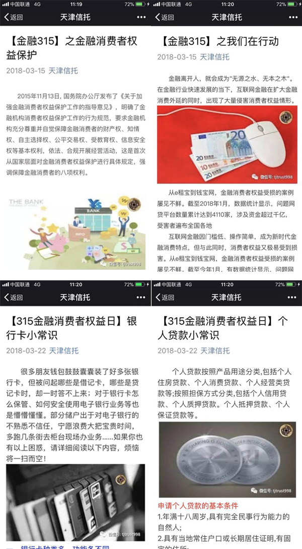 天津信托通過(guò)懸掛宣傳橫幅,展示電子海報(bào)、易拉寶,播放金融知識(shí)宣傳片、發(fā)放自行設(shè)計(jì)的知識(shí)手冊(cè)等方式面向每一位到現(xiàn)場(chǎng)的客戶進(jìn)行宣傳。同時(shí),公司還有效地利用微信平臺(tái)進(jìn)行專題宣傳,內(nèi)容涉及消保知識(shí)、互聯(lián)網(wǎng)金融、銀行卡知識(shí)、個(gè)人貸款知識(shí)等內(nèi)容。公司財(cái)富中心工作人員利用面對(duì)面接待消費(fèi)者的機(jī)會(huì),積極向客戶宣傳金融安全知識(shí),揭示辨別各種渠道非法金融廣告的方法,提示客戶如何認(rèn)清不合理的收益過(guò)高的非法金融產(chǎn)品,避免被誤導(dǎo)而購(gòu)買(mǎi)不符合自身風(fēng)險(xiǎn)偏好的金融產(chǎn)品,提高金融消費(fèi)者的自我保護(hù)能力。