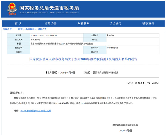 近期,天津市國家稅務(wù)局網(wǎng)站公布了2018年度納稅信用評(píng)價(jià)結(jié)果為A的納稅人名單,天津信托赫然在列。這已是公司連續(xù)第7年被評(píng)為A級(jí)納稅人。