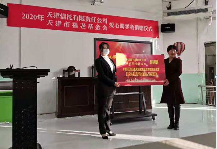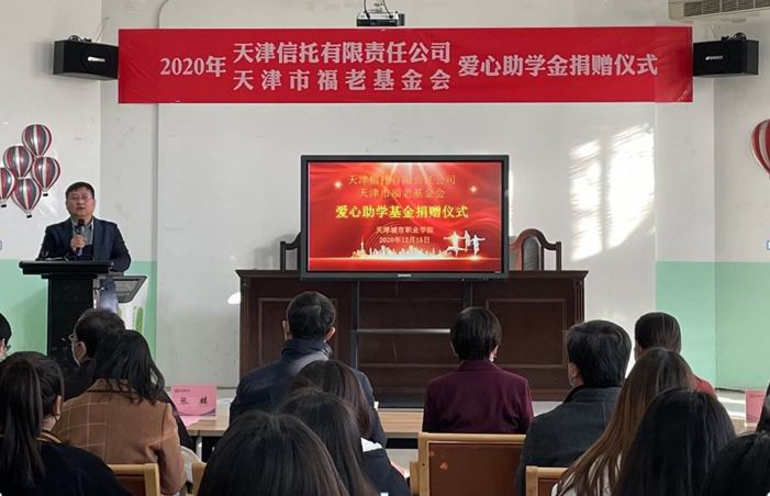 2020年12月15日,天津信托有限責(zé)任公司攜手天津市福老基金會在天津城市職業(yè)學(xué)院舉行“2020年天津信托有限責(zé)任公司、天津市福老基金會愛心助學(xué)基金捐贈儀式”?!疤煨攀兰?信德大田集團(tuán)愛心助學(xué)慈善信托”捐資117000元,對天津城市職業(yè)學(xué)院老年服務(wù)與管理專業(yè)經(jīng)濟(jì)困難學(xué)生和優(yōu)秀學(xué)生進(jìn)行資助和獎勵。