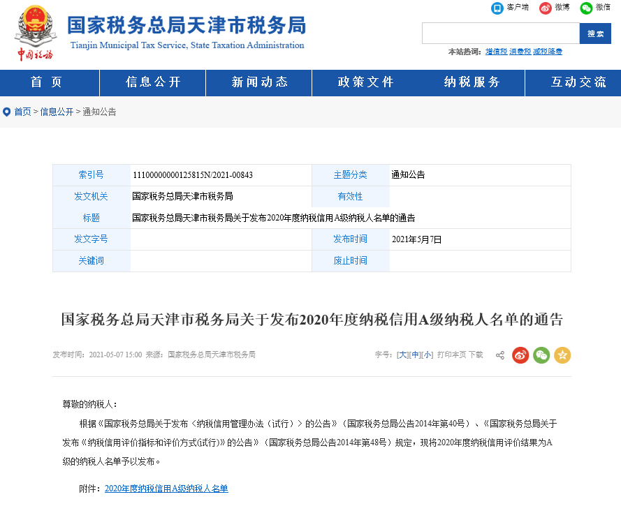 近日,國家稅務(wù)總局天津市稅務(wù)局網(wǎng)站公布了2020年度納稅信用評價結(jié)果,我公司已連續(xù)第9年被評為A級納稅人。